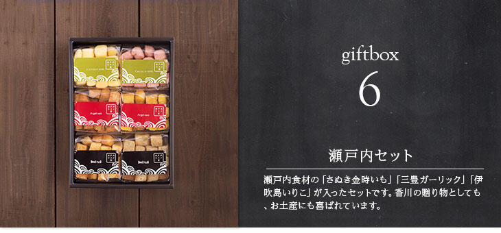おみやげには瀬戸内食材を使った「瀬戸内セット」(6個いり)がお薦めです。