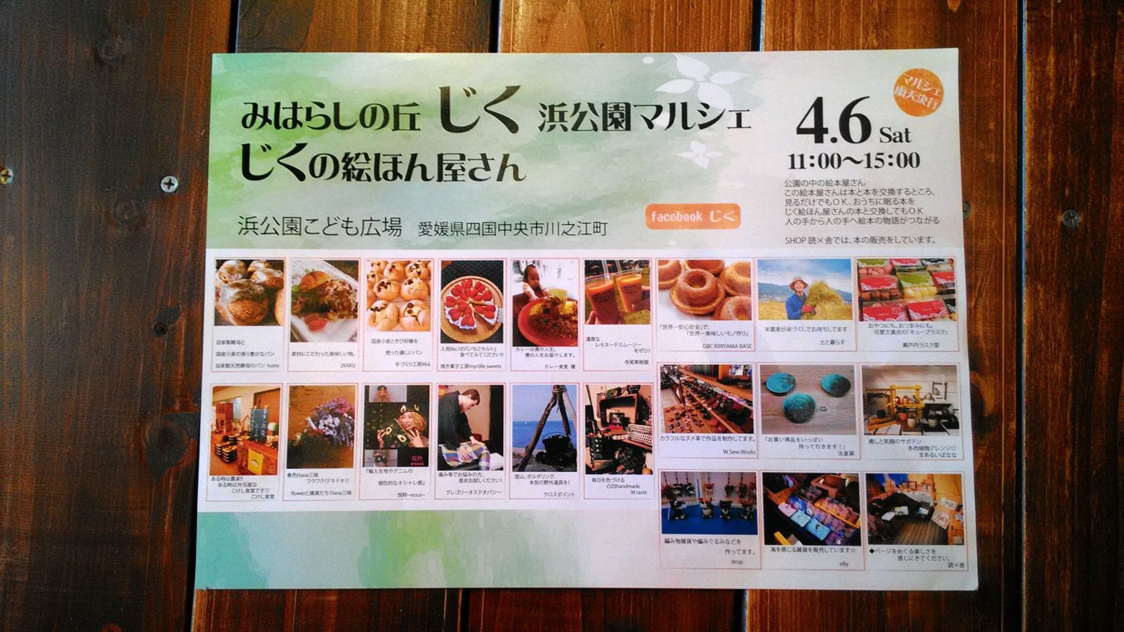じくマルシェさんから、 4月6日(土)に行われる「じく 浜公園マルシェ」のチラシが届きました。(^^) じくマルシェさんは、アットホームな温かい雰囲気のマルシェで いつも楽しく出店させていただいています。 場所は、愛媛県 […]